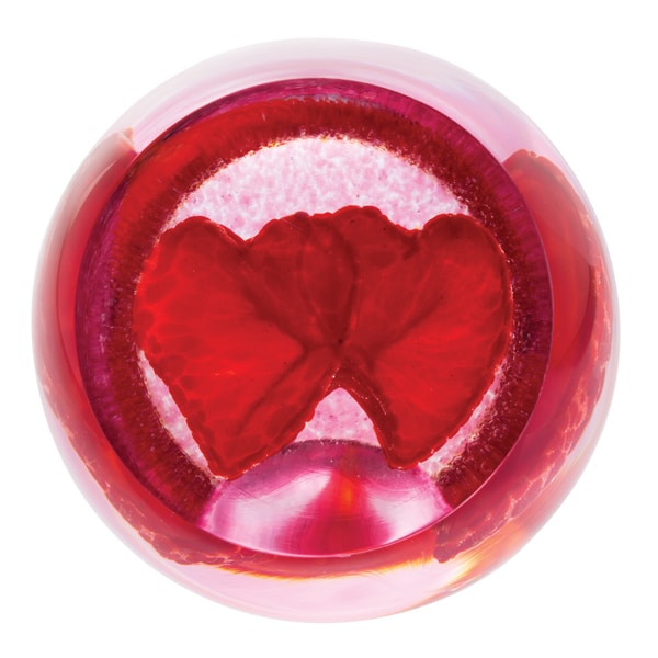 Décor entièrement réalisé à la main par inclusions de pigments colorés et d’oxydes métalliques appliqués sur plusieurs épaisseurs selon la technique dite « overlay », découvrant un motif figuratif de deux cœurs enlacés en trois dimensions,  disposé sur un fond de couleur rouge rubis.