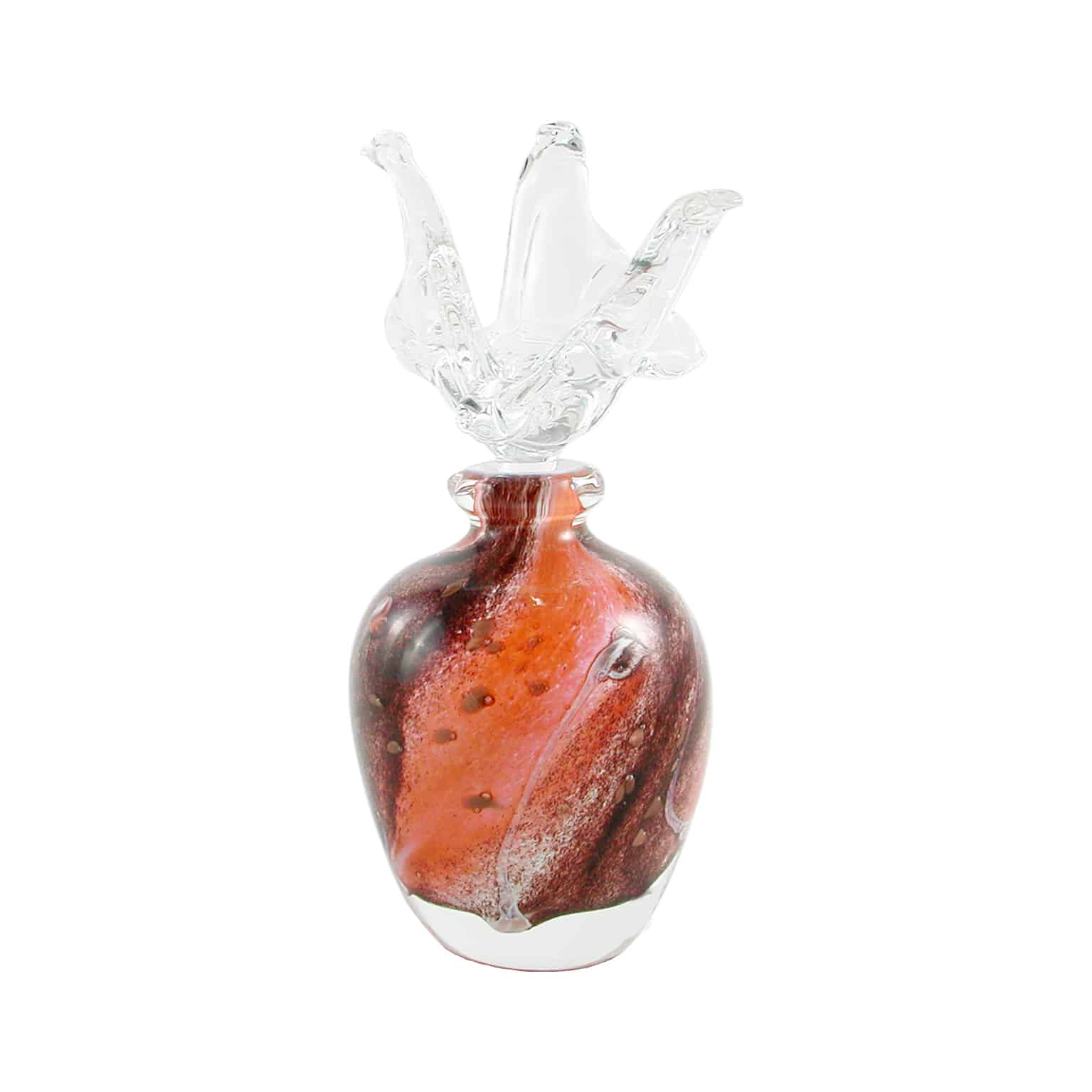 Décor entièrement réalisé à la main par inclusions de pigments colorés et d’oxydes métalliques appliqués sur plusieurs épaisseurs selon la technique dite « Overlay », figurant un paysage imaginaire abstrait sur fond de couleurs à dominantes rouge rubis et corail, rehaussé d’aventurine.