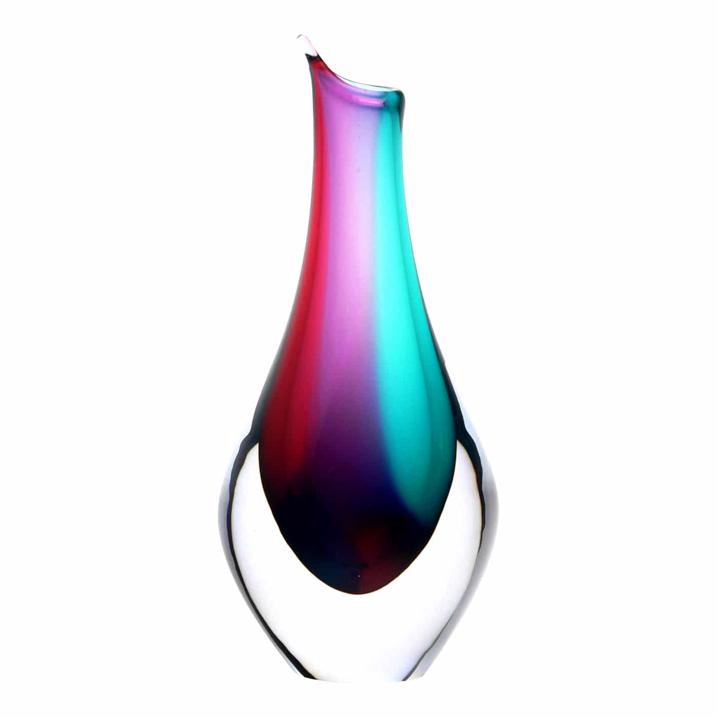 Décor entièrement réalisé à la main par inclusions de pigments colorés et d’oxydes métalliques appliqués sur plusieurs épaisseurs, selon la technique dite «overlay», formant un motif abstrait à dominantes de couleurs turquoise & rose rubis.