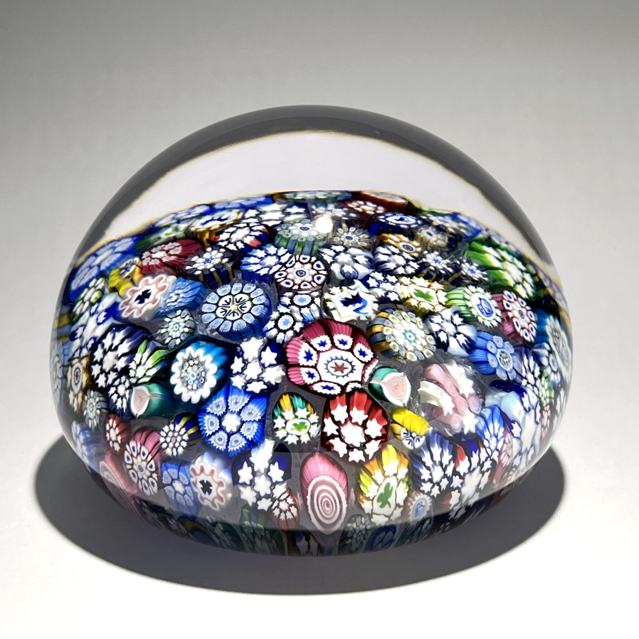 Millefiori composé d’un motif de murrines concentriques polychromes complexes disposées en pêle-mêle sur un fond de mousseline blanche.