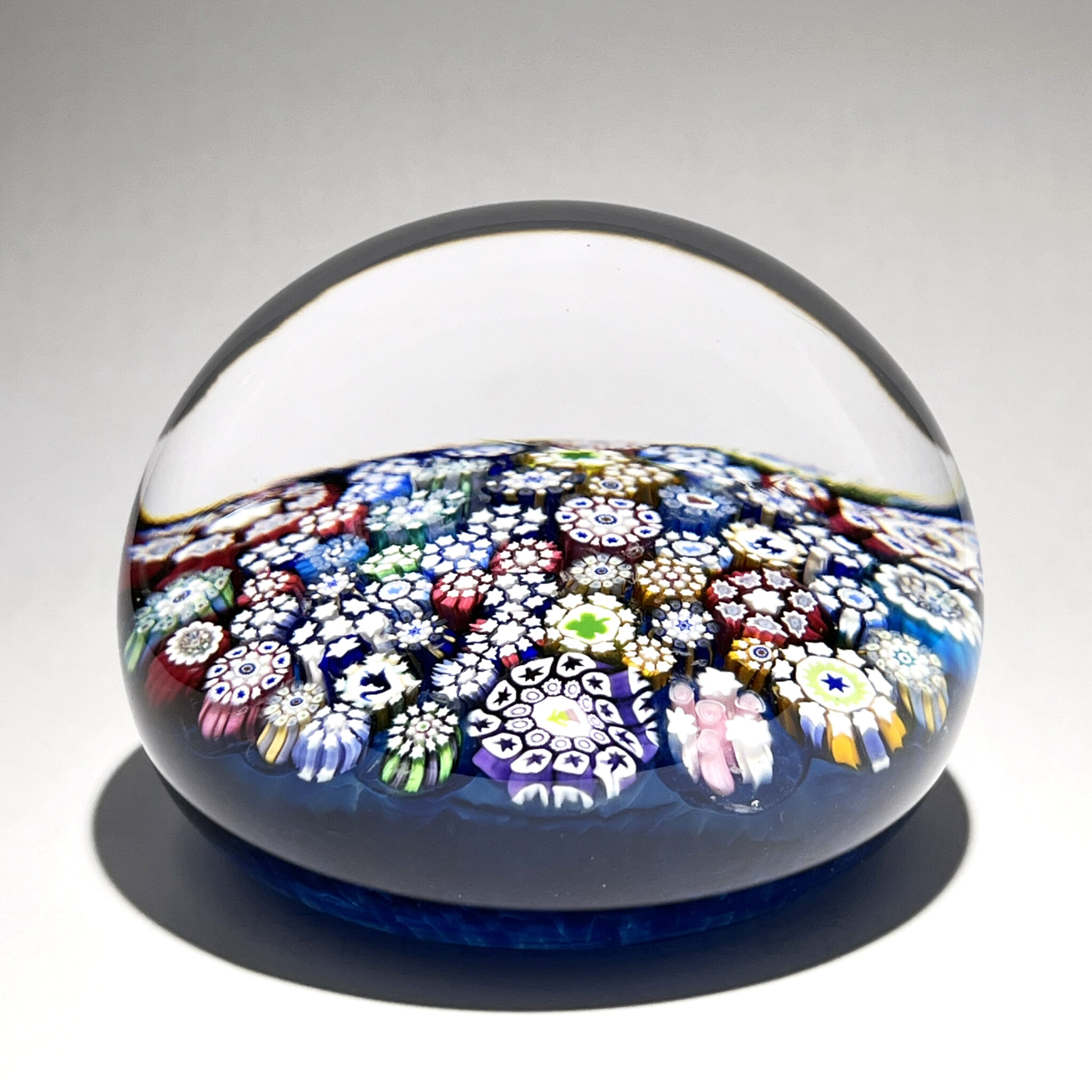 Millefiori composé d’un motif de murrines concentriques polychromes complexes disposées en pêle-mêle sur un fond uni bleu saphir.