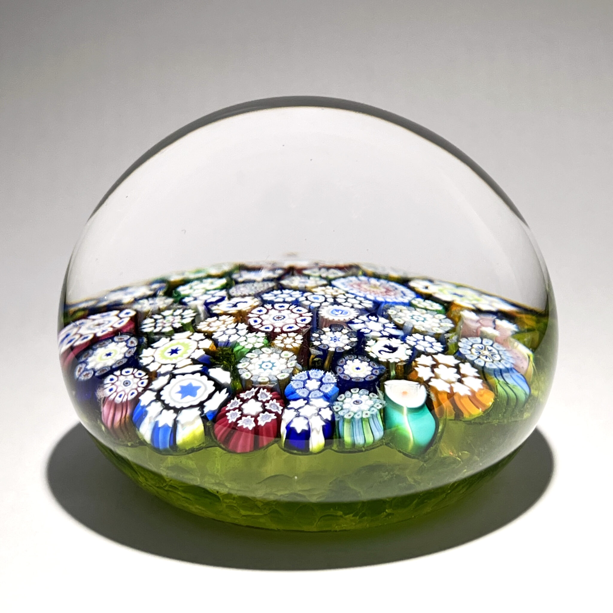 Millefiori composé d’un motif de murrines concentriques polychromes complexes disposées en pêle-mêle sur un fond uni vert mousse.