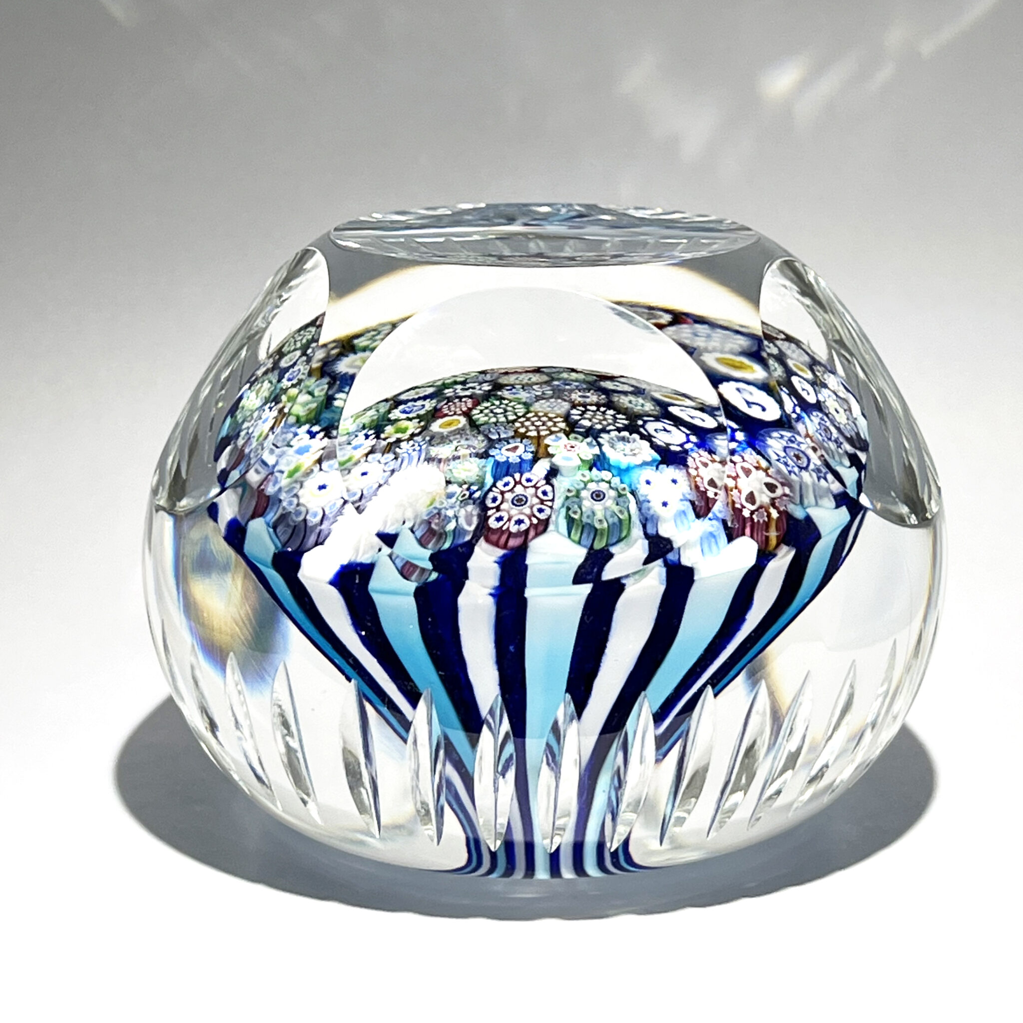 Exceptionnel Millefiori composé d’un motif de murrines polychromes complexes et de silhouettes disposées sur un champignon à baguettes alternées bleues et blanches.