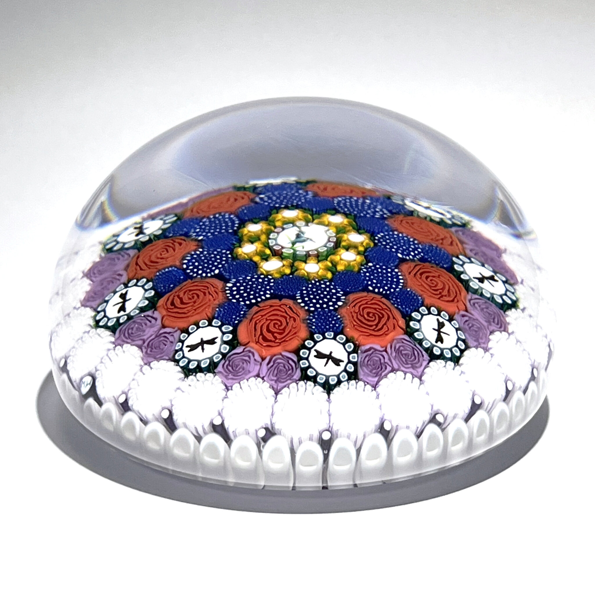 Exceptionnel Millefiori composé d’un motif de six cercles concentriques de Murrines polychromes complexes, de roses Clichy et de silhouettes de libellules et d’oiseaux, disposé sur un fond à baguettes blanches au revers.