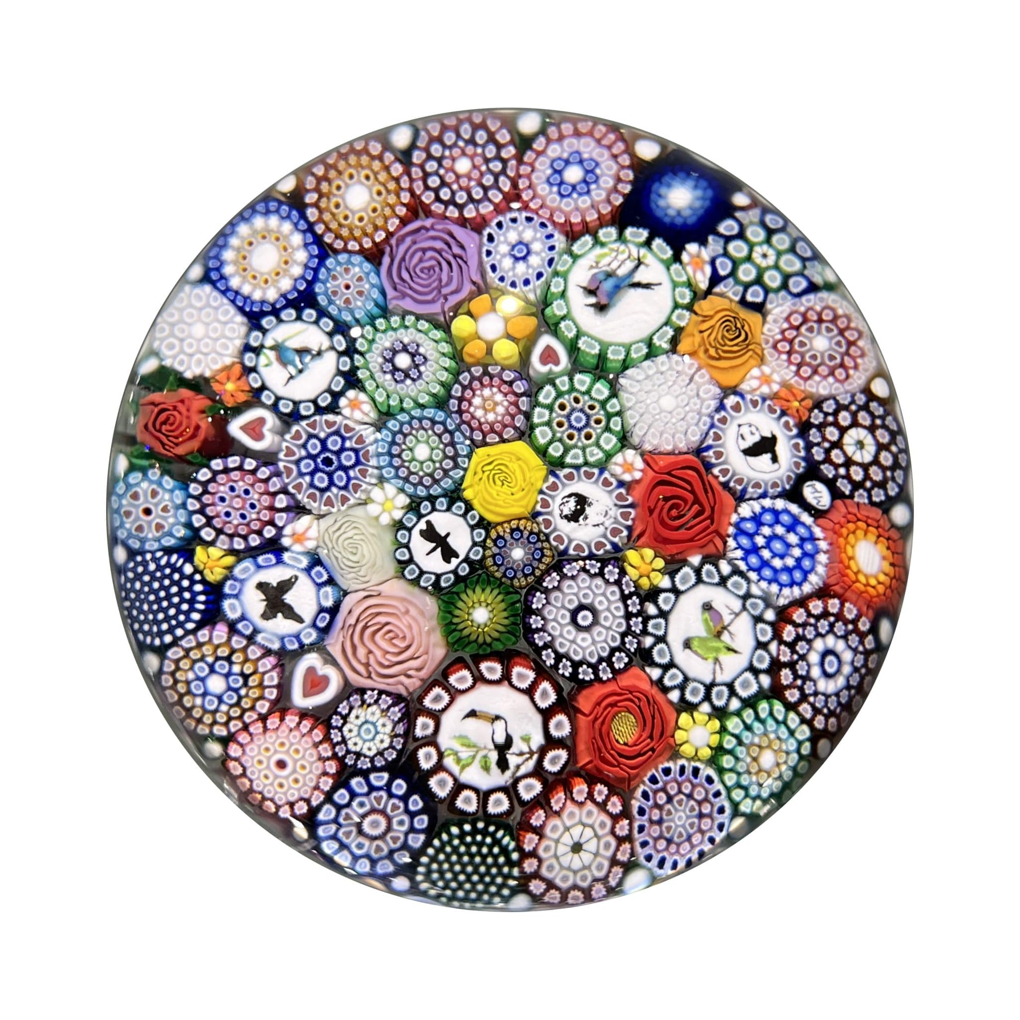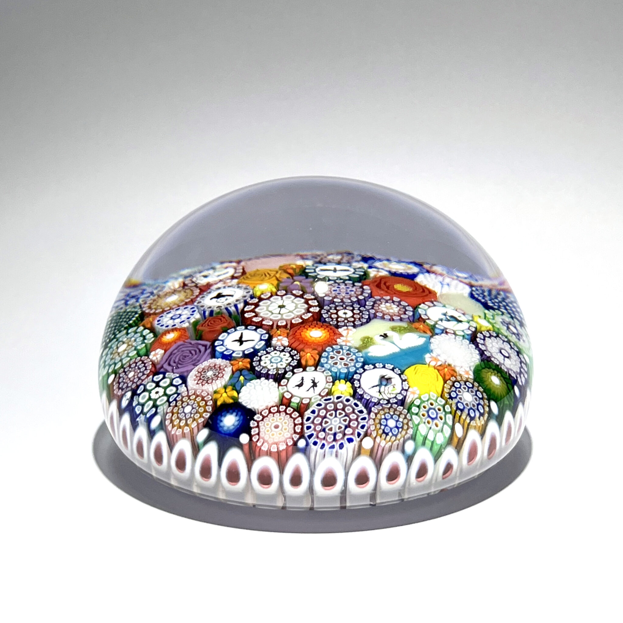 Exceptionnel Millefiori composé d’un motif de Murrines polychromes complexes organisées en pêle-mêle, de roses Clichy et de silhouettes variées, disposé sur un fond à baguettes blanches au revers.