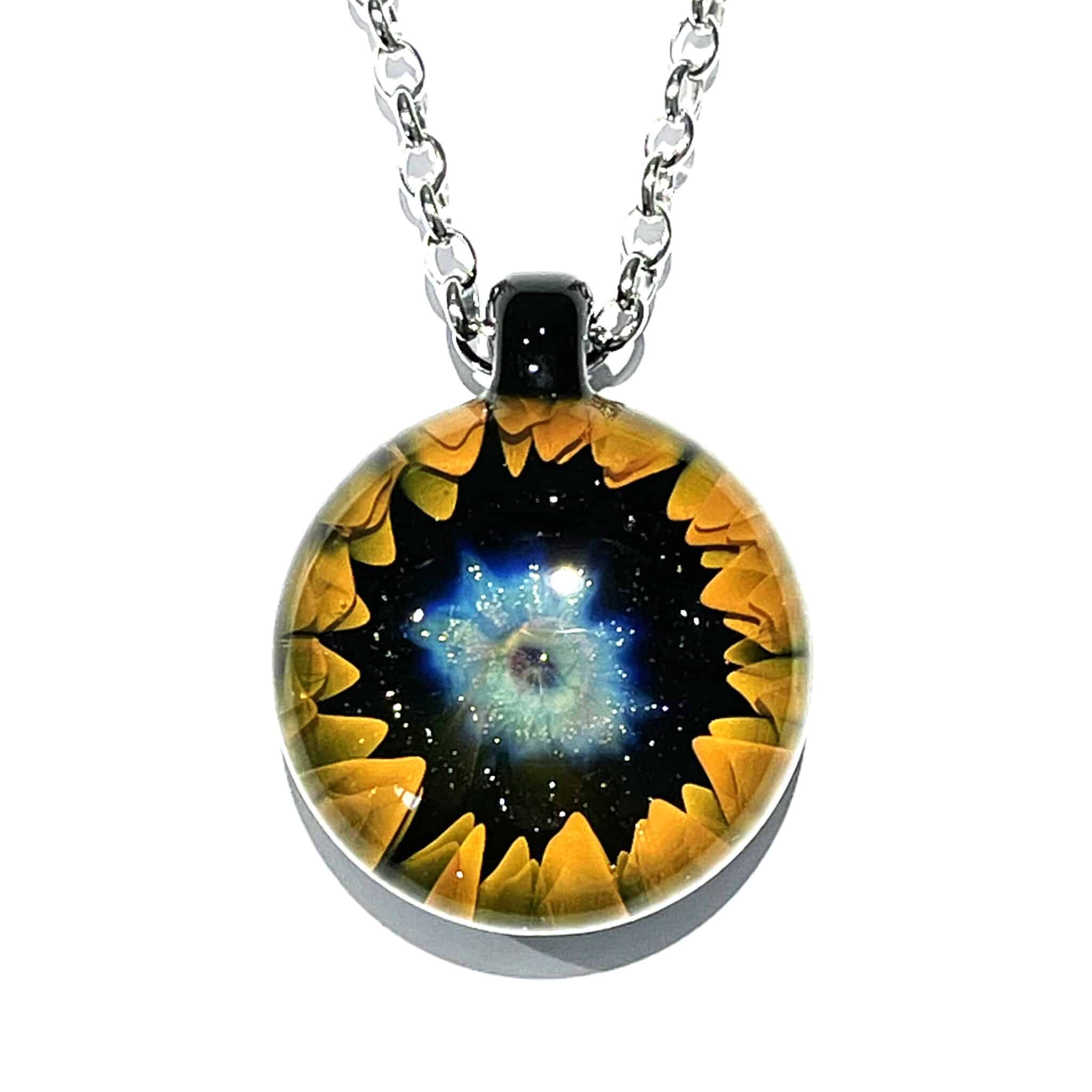 Elégant collier constitué d’un pendentif entièrement réalisé à la main par inclusions d’or et d’argent purs à 99% selon la technique dite du « fuming », découvrant un motif de galaxie stylisée disposé sur un fond noir.