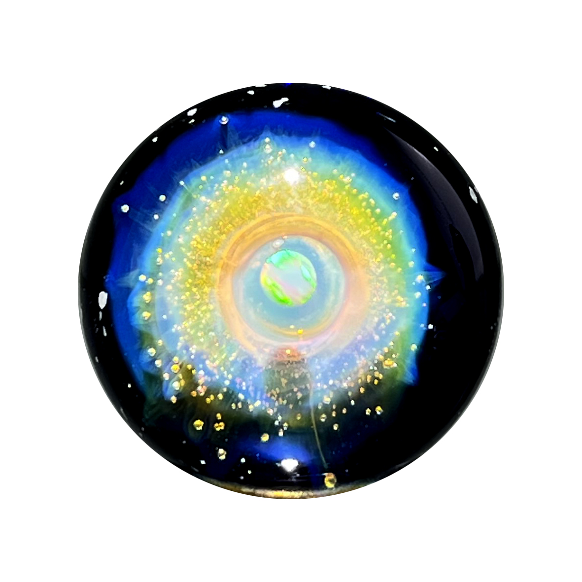 Décor entièrement réalisé à la main par inclusions d’or et d’argent purs à 99% selon la technique dite du « fuming », découvrant un profond motif cosmique de galaxie,  de nébuleuse ou de paysage céleste disposé sur un fond obscur révélant l’inclusion d’un fragment d’opale.