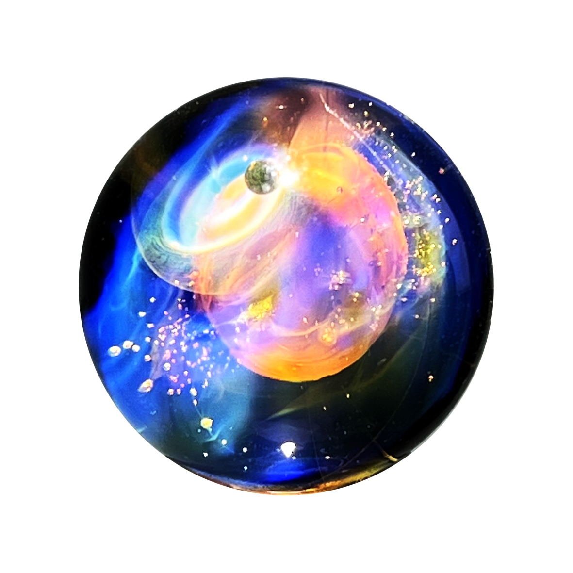 Décor entièrement réalisé à la main par inclusions d’or et d’argent purs à 99% selon la technique dite du « fuming », découvrant un profond motif cosmique de galaxie, de nébuleuse ou de paysage céleste disposé sur un fond obscur révélant l’inclusion d’un fragment d’opale.