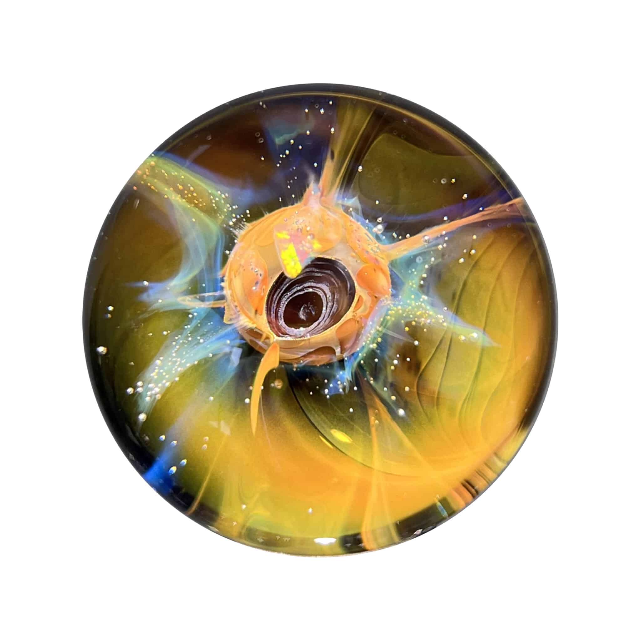 Décor entièrement réalisé à la main par inclusions d’or et d’argent purs à 99% selon la technique dite du « fuming », découvrant un profond motif cosmique de galaxie,  de nébuleuse ou de paysage céleste disposé sur un fond obscur révélant l’inclusion d’un fragment d’opale.