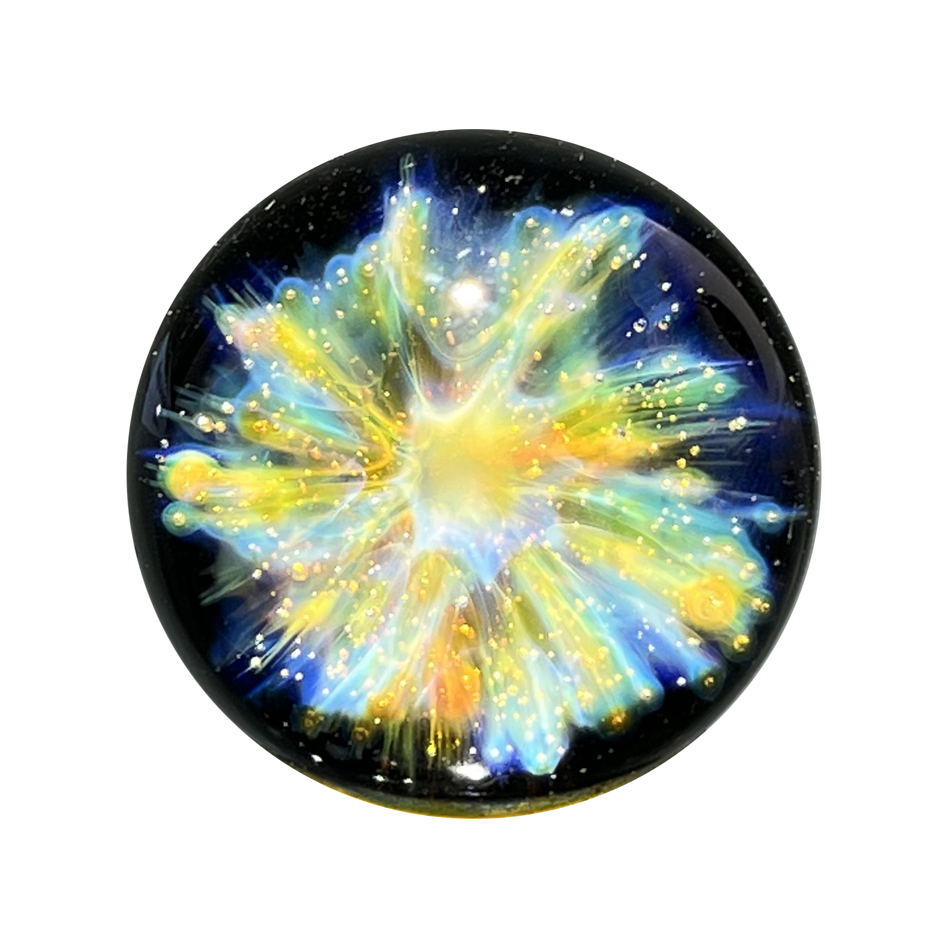 Décor entièrement réalisé à la main par inclusions d’or et d’argent purs à 99% selon la technique dite du « fuming », découvrant un profond motif cosmique de galaxie, de nébuleuse ou de paysage céleste disposé sur un fond opaque.
