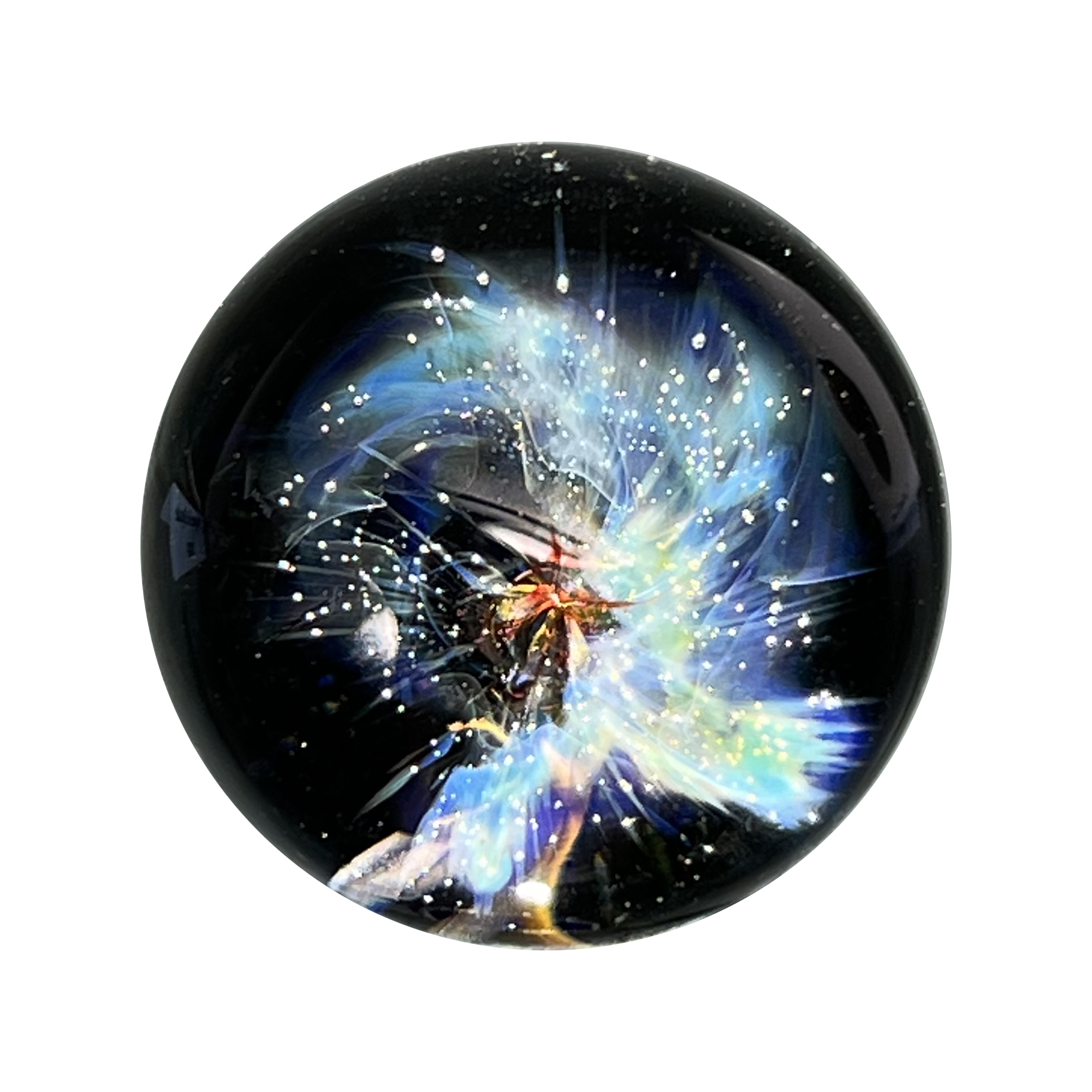 Décor entièrement réalisé à la main par inclusions d’or et d’argent purs à 99% selon la technique dite du « fuming », découvrant un profond motif cosmique de galaxie,  de nébuleuse ou de paysage céleste disposé sur un fond opaque.