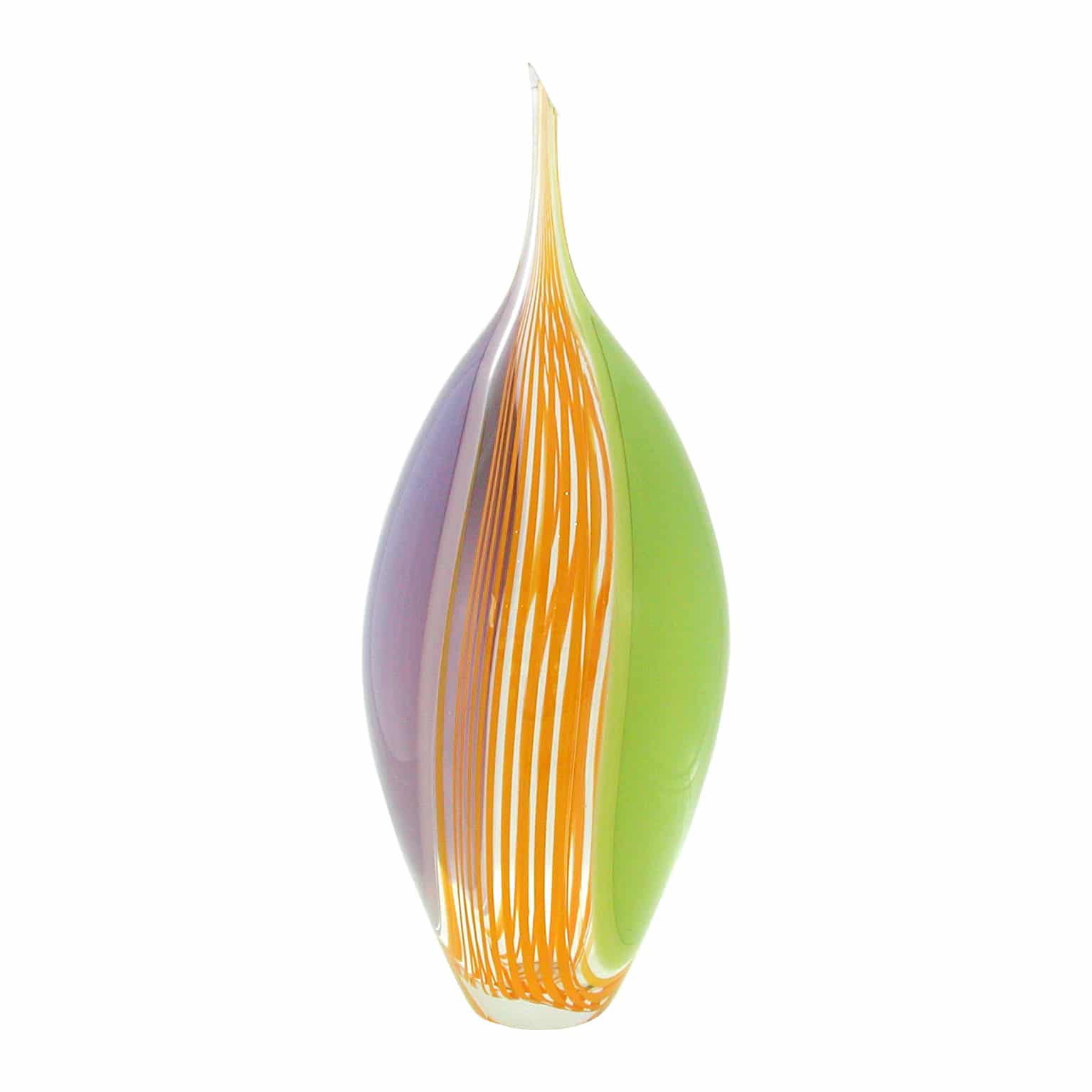 Décor entièrement réalisé à la main par inclusions de couleurs et de pigments appliqués sur plusieurs épaisseurs selon la technique dite « Overlay », formant un motif géométrique de bandes et de rayures verticales multicolores.