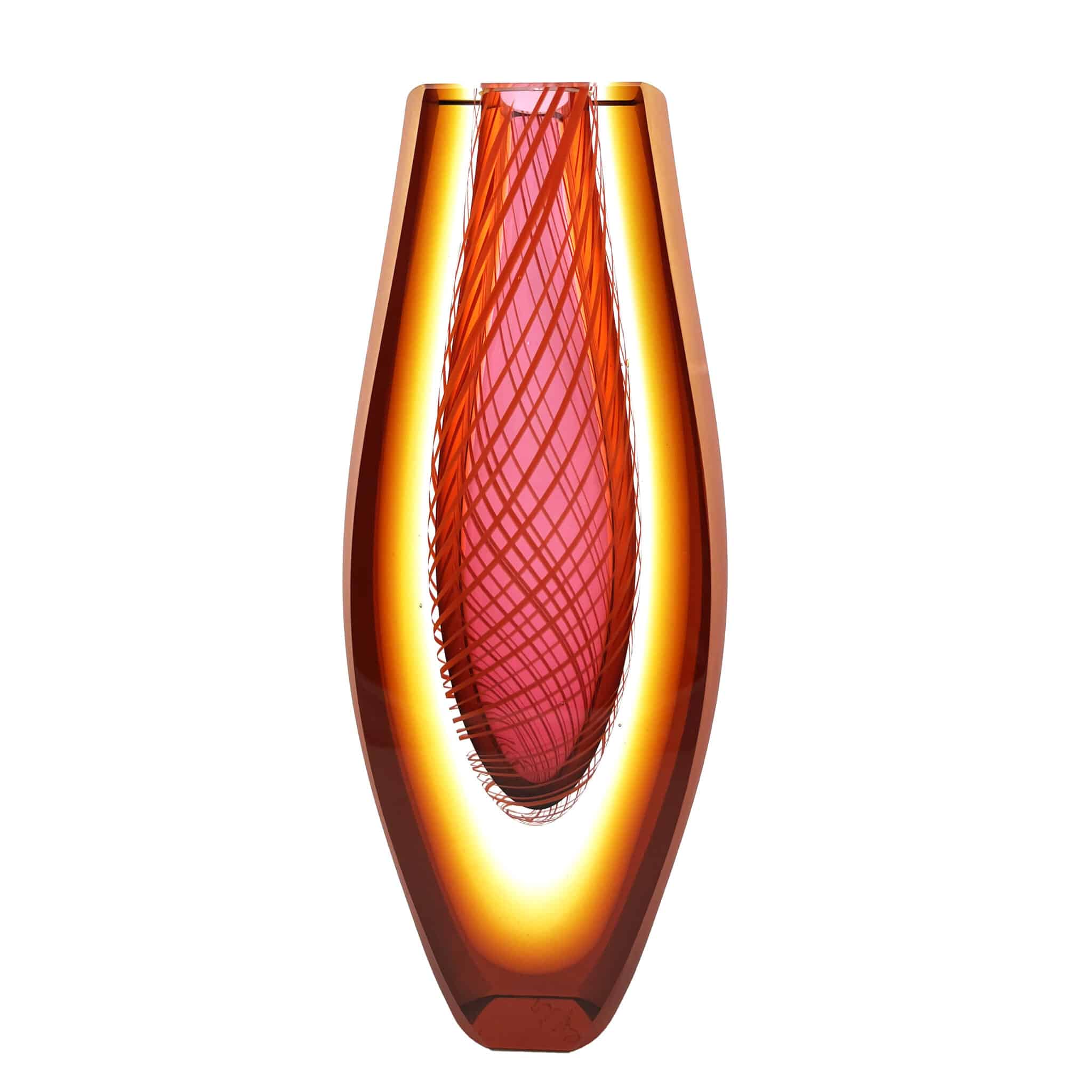 Décor entièrement réalisé à la main par inclusions de pigments colorés et d’oxydes métalliques appliqués sur plusieurs épaisseurs, selon la technique dite «overlay», formant un motif abstrait à dominantes de couleurs brun ambré & rouge corail.