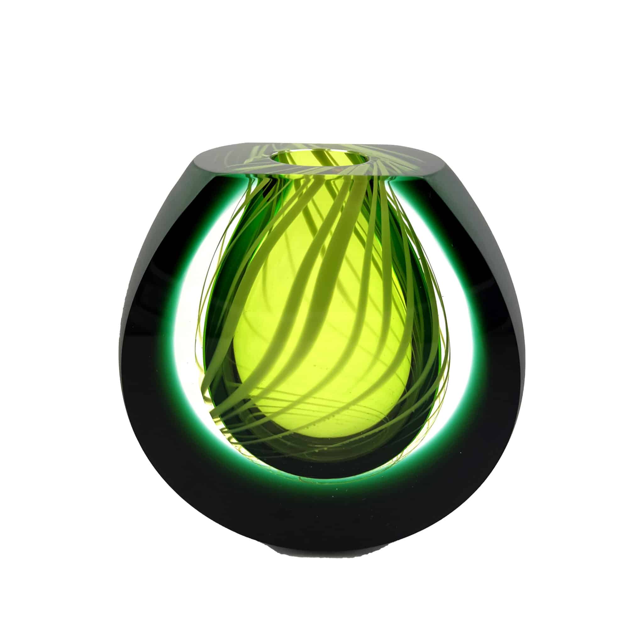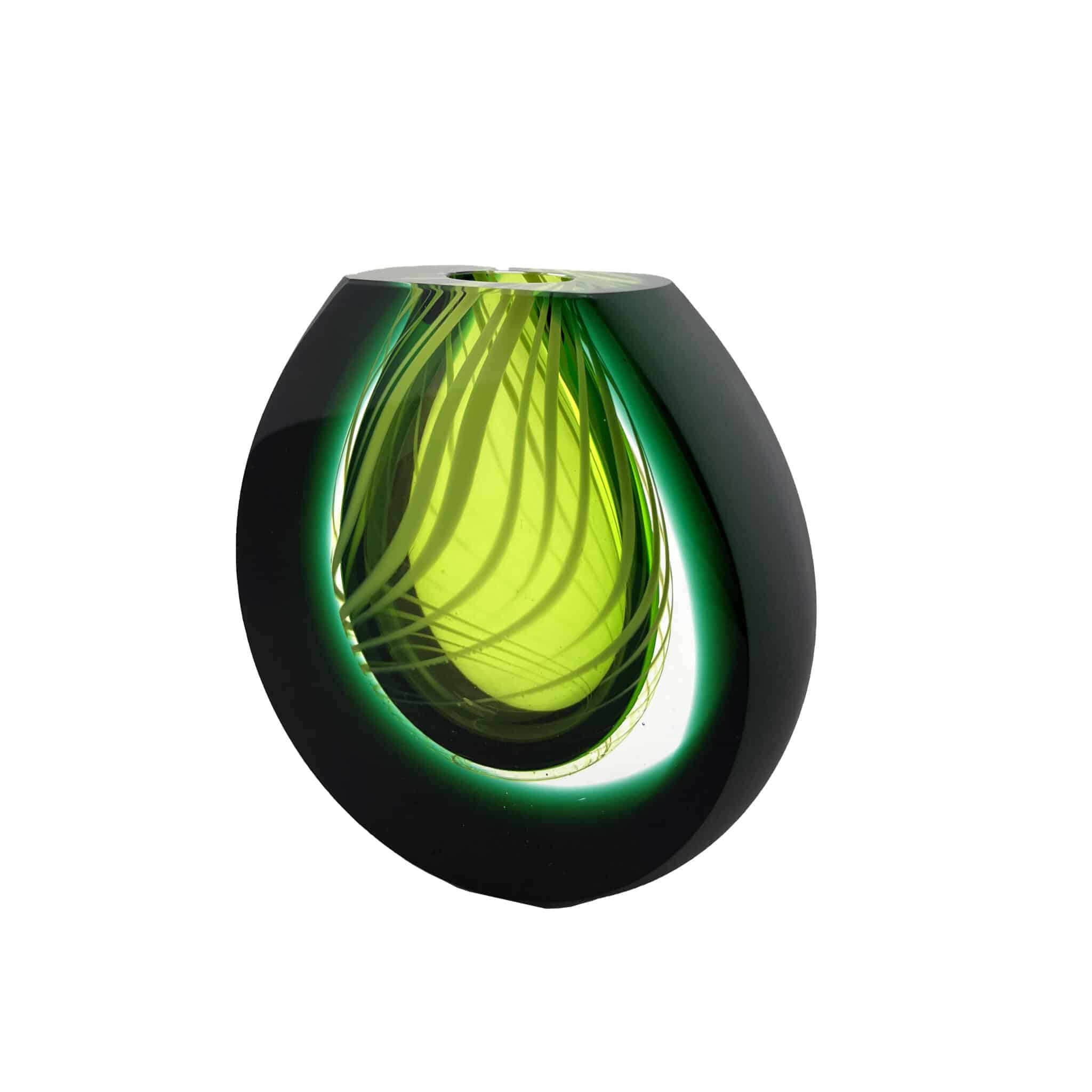Décor entièrement réalisé à la main par inclusions de pigments colorés et d’oxydes métalliques appliqués sur plusieurs épaisseurs, selon la technique dite «overlay», formant un motif abstrait à dominantes de couleurs vert anis & vert émeraude.