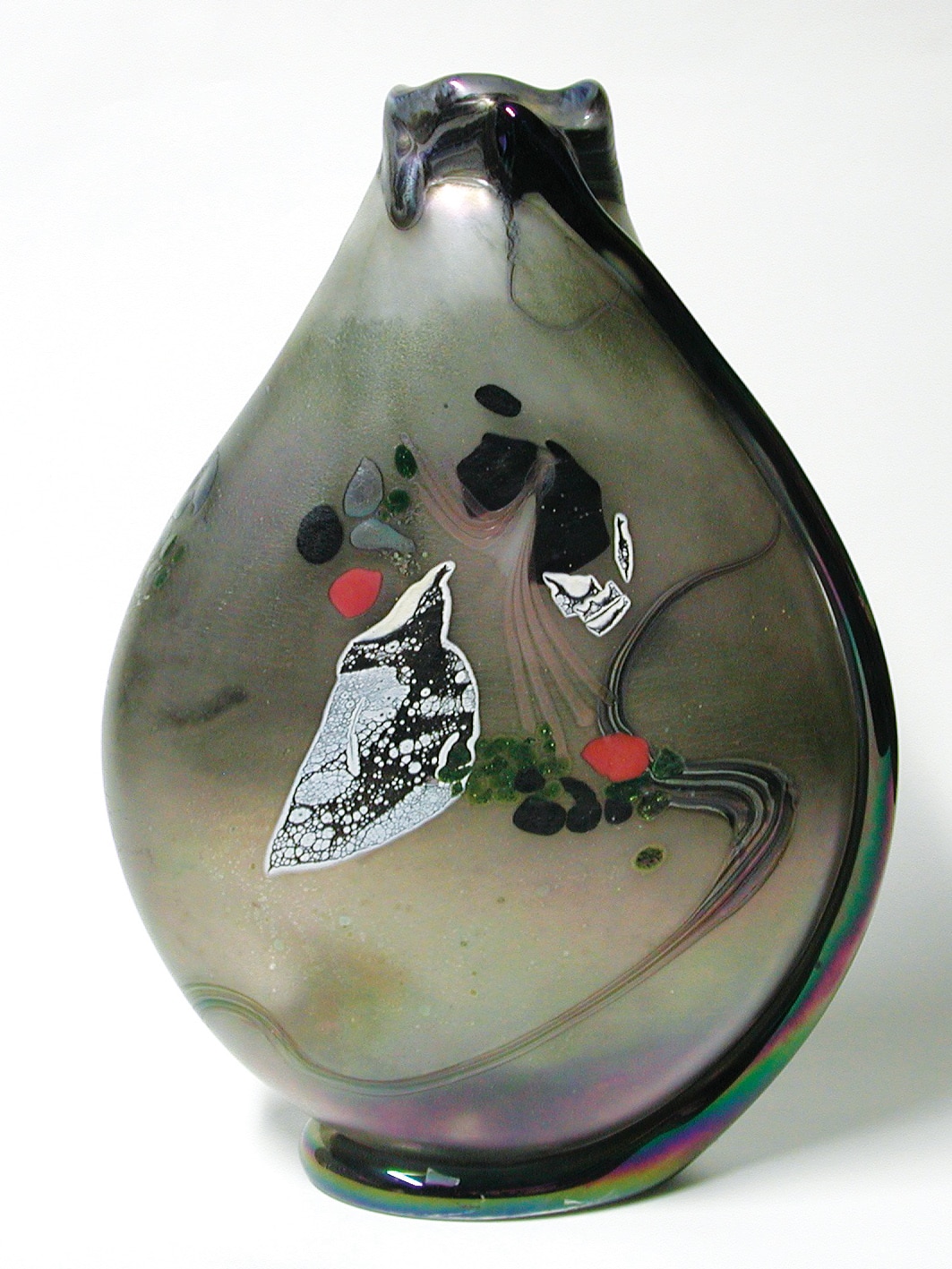 Décor entièrement réalisé à la main par inclusions de pigments colorés et d’oxydes métalliques appliqués sur plusieurs épaisseurs selon la technique dite « Overlay », découvrant un motif naturaliste abstrait aux subtiles combinaisons de couleurs, disposé sur un fond irisé à dominante grise