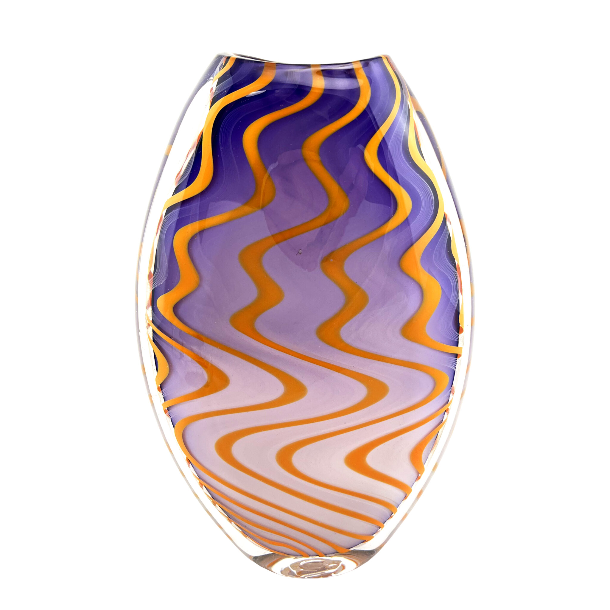 Décor entièrement réalisé à la main par inclusions de pigments colorés et d’oxydes métalliques appliqués sur plusieurs épaisseurs selon la technique dite « Overlay », découvrant un motif graphique orangé, disposé sur un fond uni à dominante violet-améthyste.