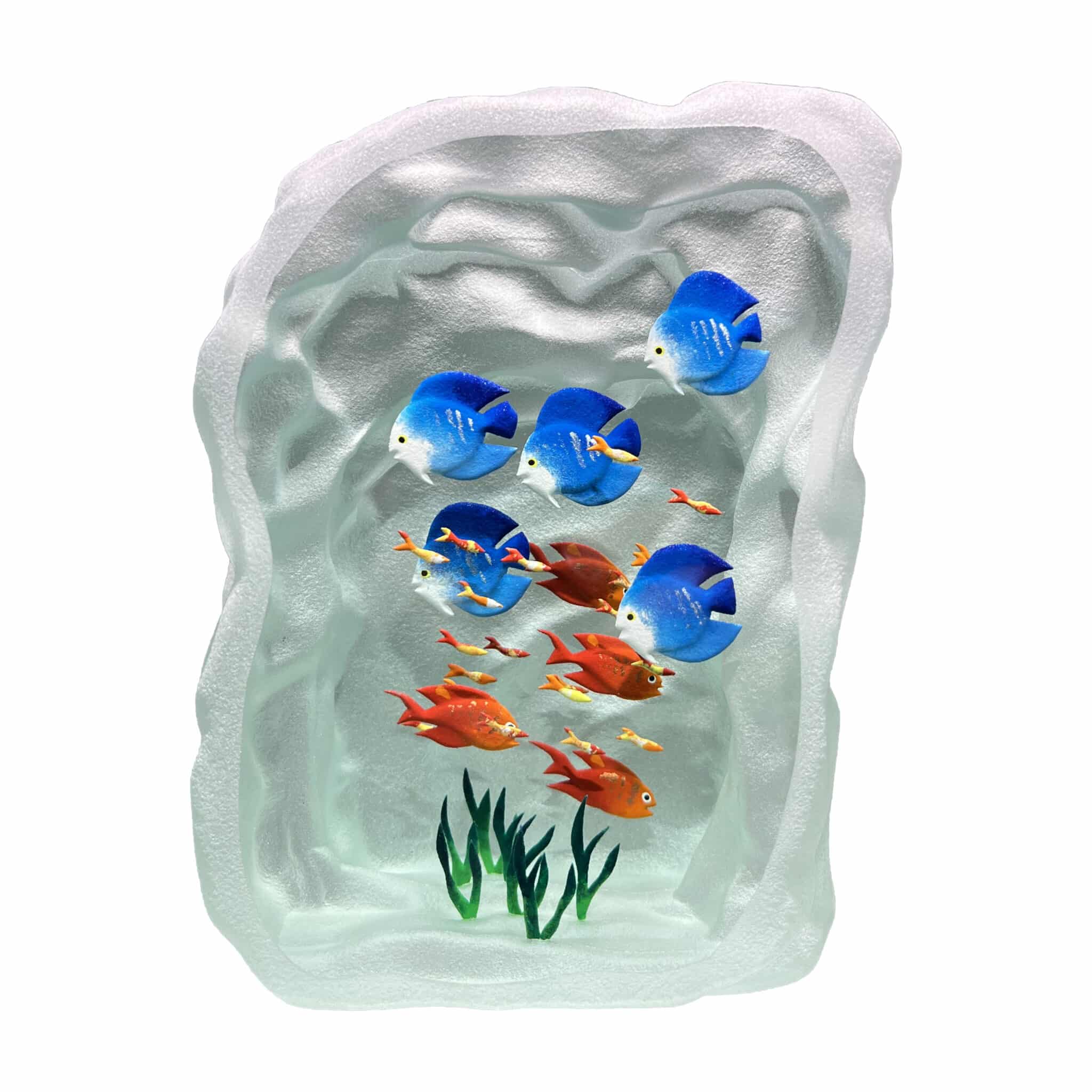 Décor entièrement réalisé à la main par gravure à froid sur plusieurs épaisseurs et inclusions de pigments de couleurs, figurant un motif de lagon aquatique en trois dimensions, montrant une multitude poissons multicolores, de coraux ou d’algues, sur fond de grotte marine.
