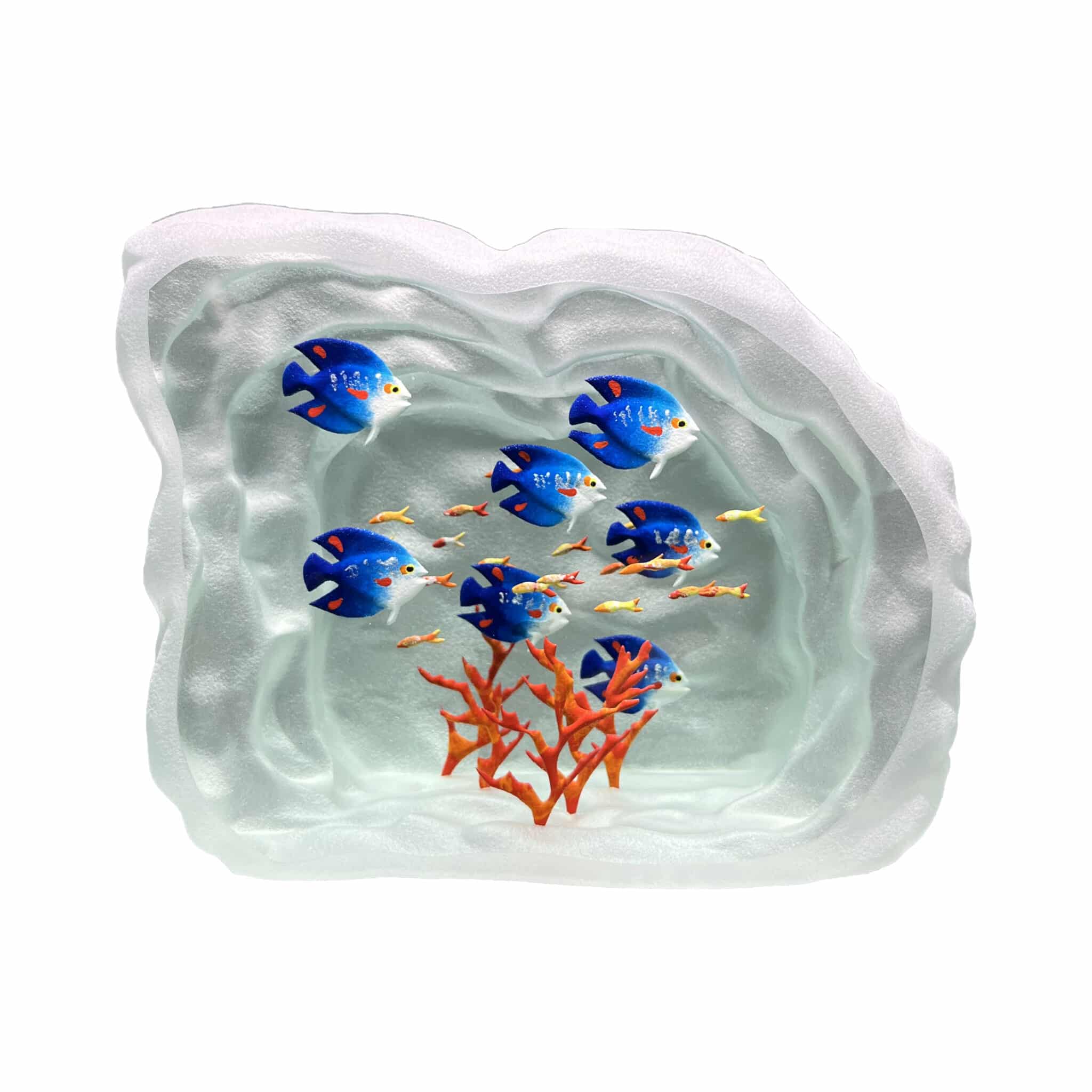 Décor entièrement réalisé à la main par gravure à froid sur plusieurs épaisseurs et inclusions de pigments de couleurs, figurant un motif de lagon aquatique en trois dimensions, montrant une multitude poissons multicolores, de coraux ou d’algues, sur fond de grotte marine.