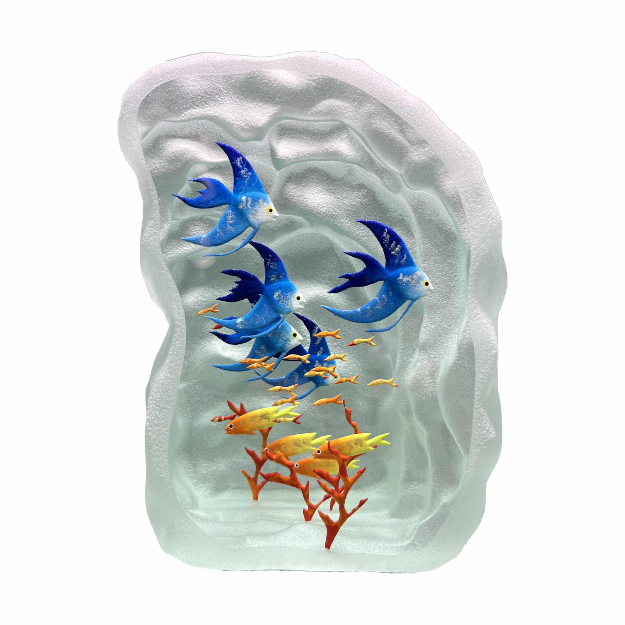 Décor entièrement réalisé à la main par gravure à froid sur plusieurs épaisseurs et inclusions de pigments de couleurs, figurant un motif de lagon aquatique en trois dimensions, montrant une multitude poissons multicolores, de coraux ou d’algues, sur fond de grotte marine.