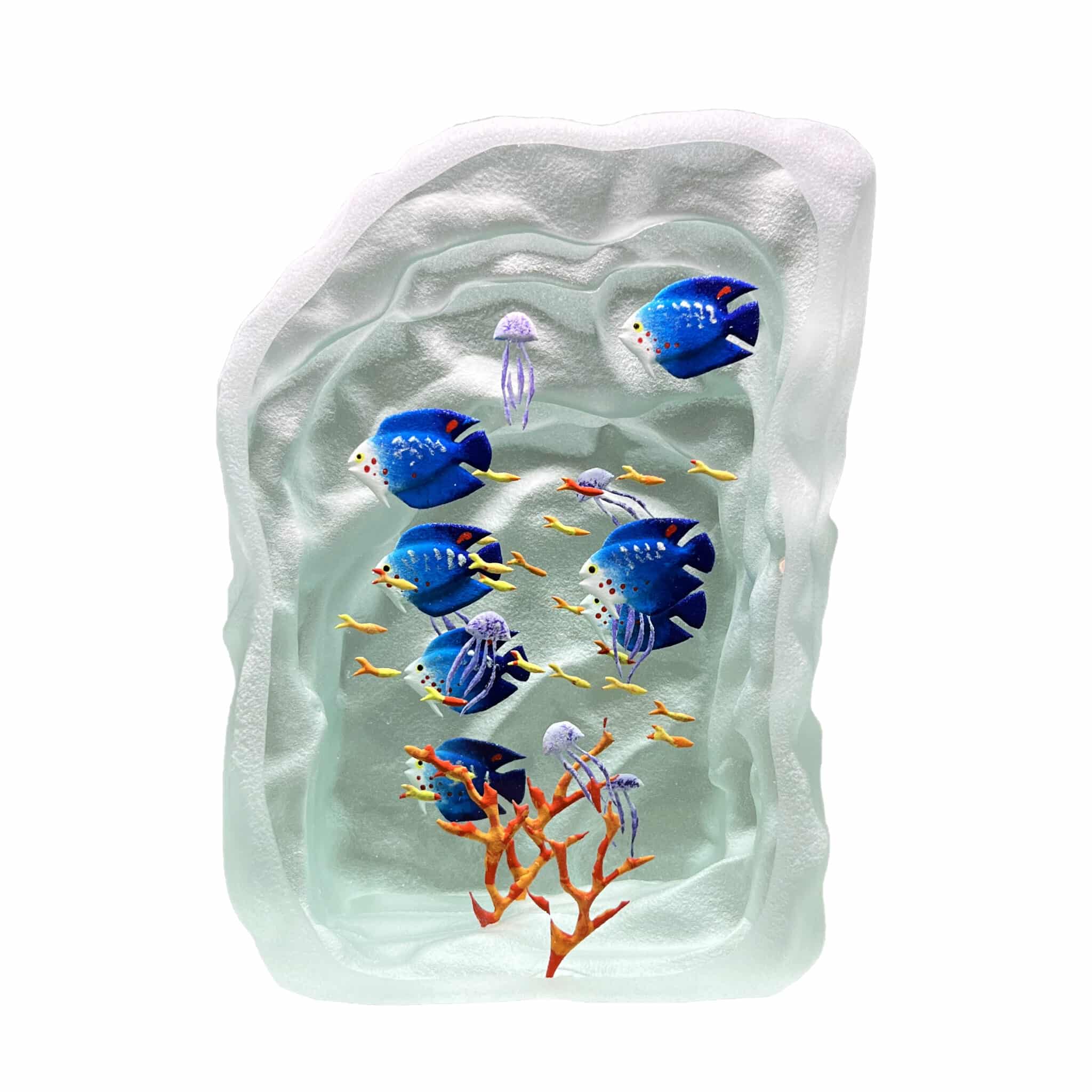 Décor entièrement réalisé à la main par gravure à froid sur plusieurs épaisseurs et inclusions de pigments de couleurs, figurant un motif de lagon aquatique en trois dimensions, montrant une multitude poissons multicolores, de coraux ou d’algues, sur fond de grotte marine.