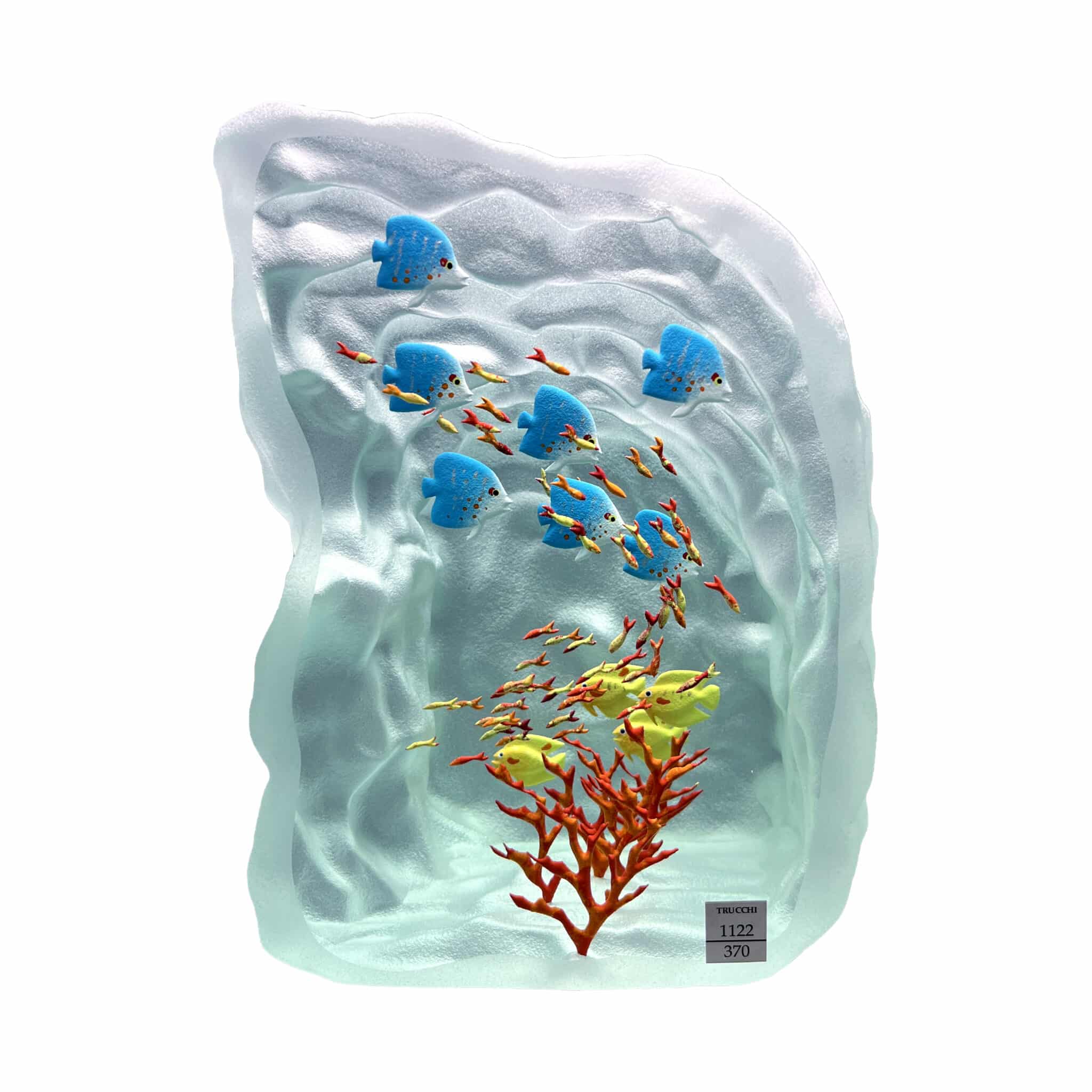 Décor entièrement réalisé à la main par gravure à froid sur plusieurs épaisseurs et inclusions de pigments de couleurs, figurant un motif de lagon aquatique en trois dimensions, montrant une multitude poissons multicolores, de coraux ou d’algues, sur fond de grotte marine.