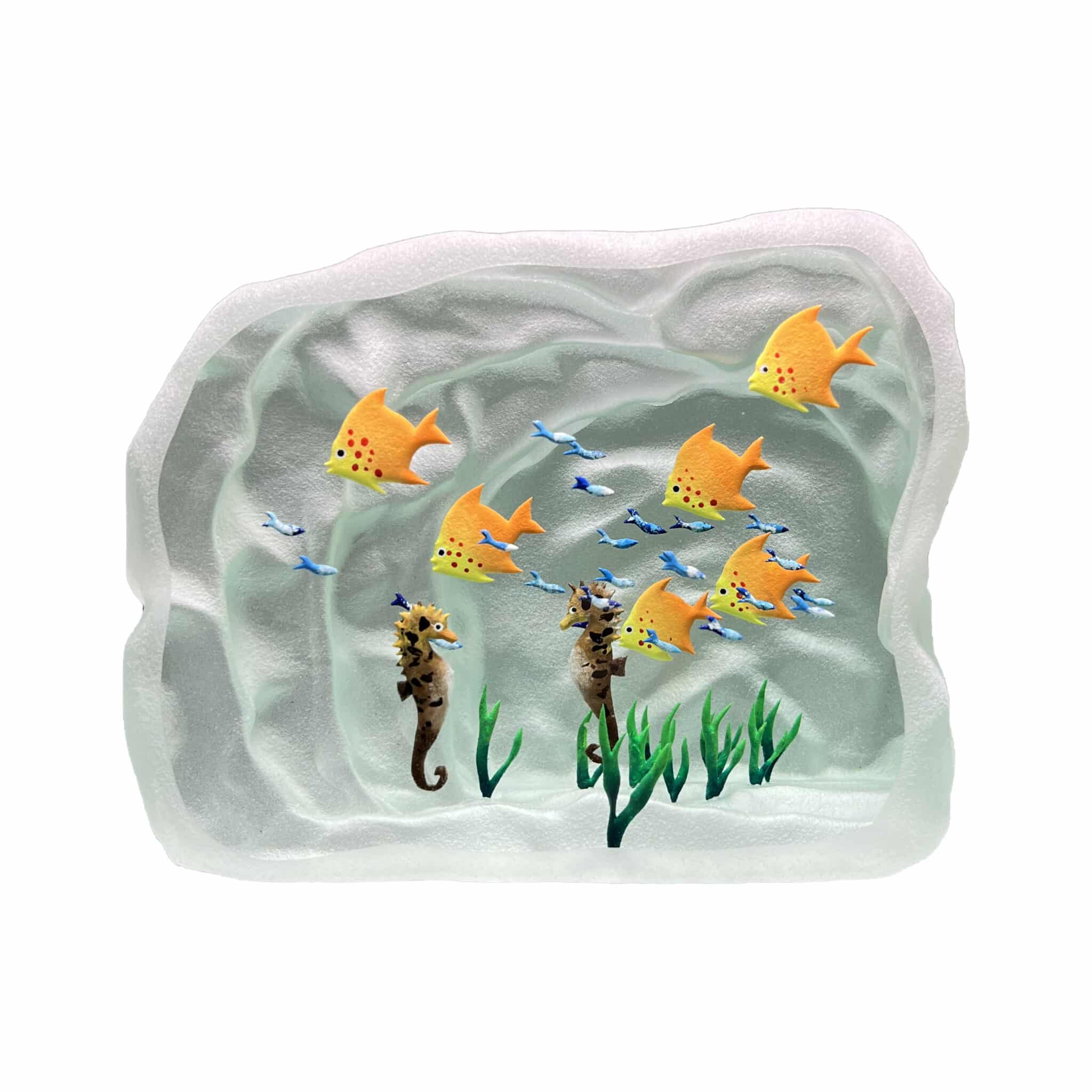 Décor entièrement réalisé à la main par gravure à froid sur plusieurs épaisseurs et inclusions de pigments de couleurs, figurant un motif de lagon aquatique en trois dimensions, montrant une multitude poissons multicolores, de coraux ou d’algues, sur fond de grotte marine.