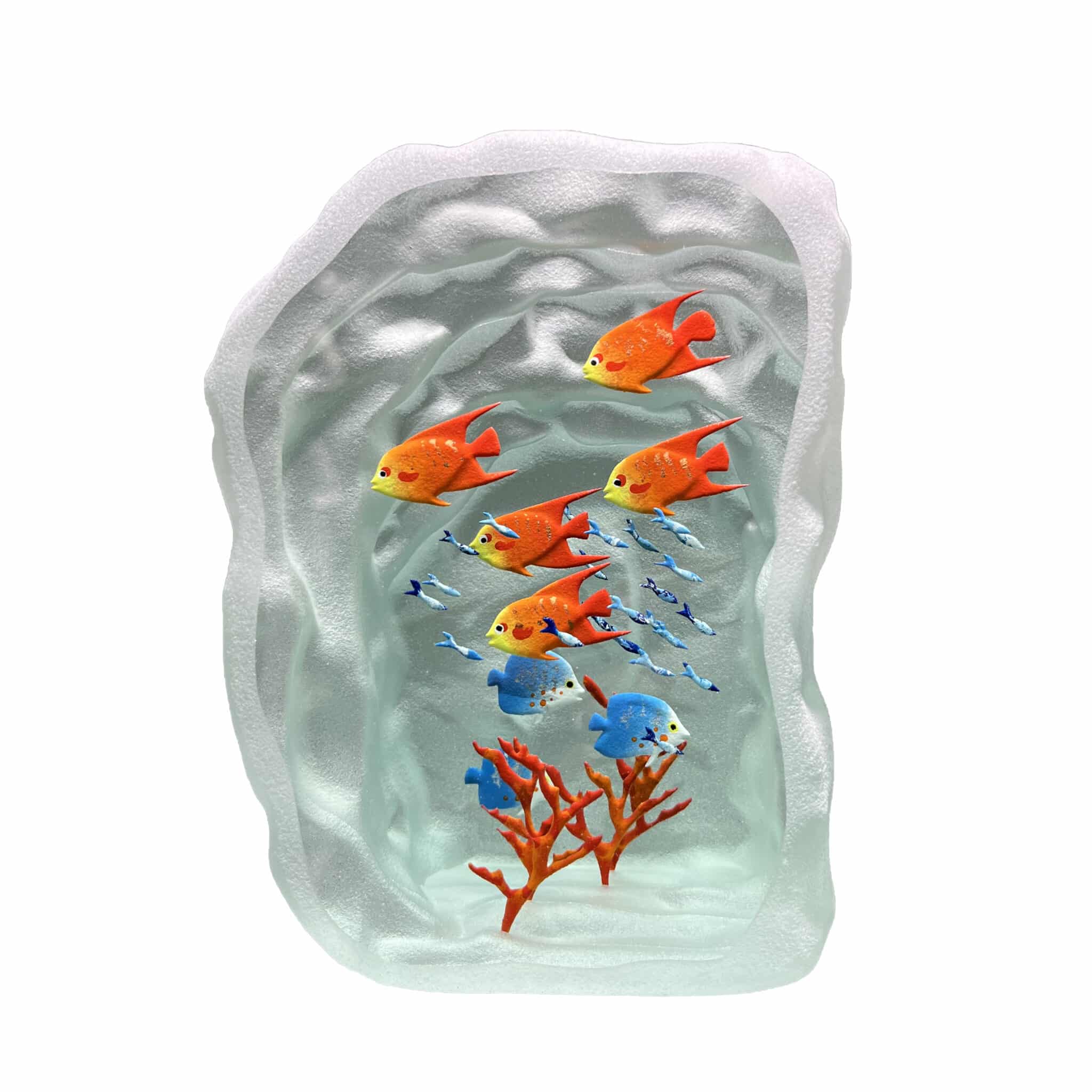 Décor entièrement réalisé à la main par gravure à froid sur plusieurs épaisseurs et inclusions de pigments de couleurs, figurant un motif de lagon aquatique en trois dimensions, montrant une multitude poissons multicolores, de coraux ou d’algues, sur fond de grotte marine.
