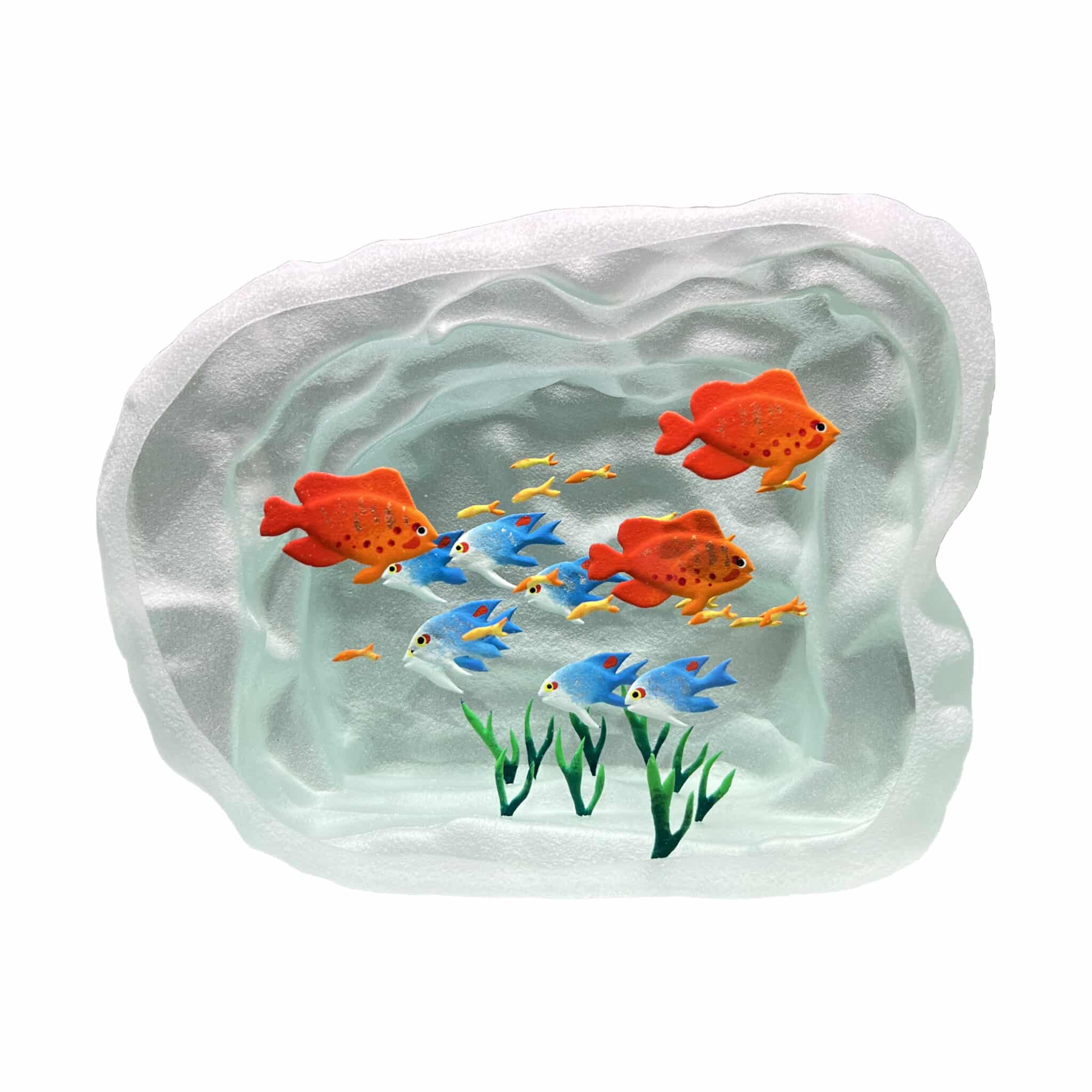 Décor entièrement réalisé à la main par gravure à froid sur plusieurs épaisseurs et inclusions de pigments de couleurs, figurant un motif de lagon aquatique en trois dimensions, montrant une multitude poissons multicolores, de coraux ou d’algues, sur fond de grotte marine.