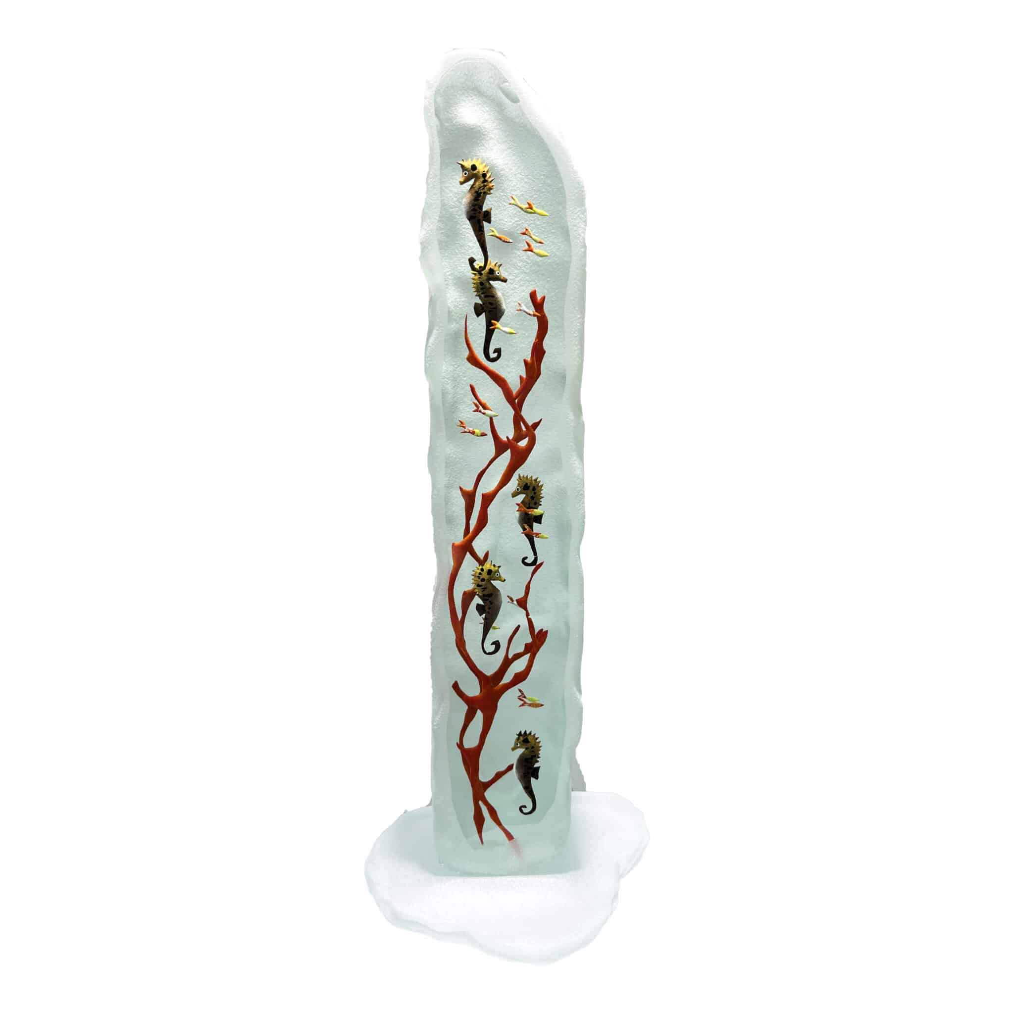Décor entièrement réalisé à la main par gravure à froid sur plusieurs épaisseurs et inclusions de pigments de couleurs, figurant un motif de lagon aquatique en trois dimensions, montrant une multitude poissons multicolores, de coraux ou d’algues, sur fond de grotte marine.