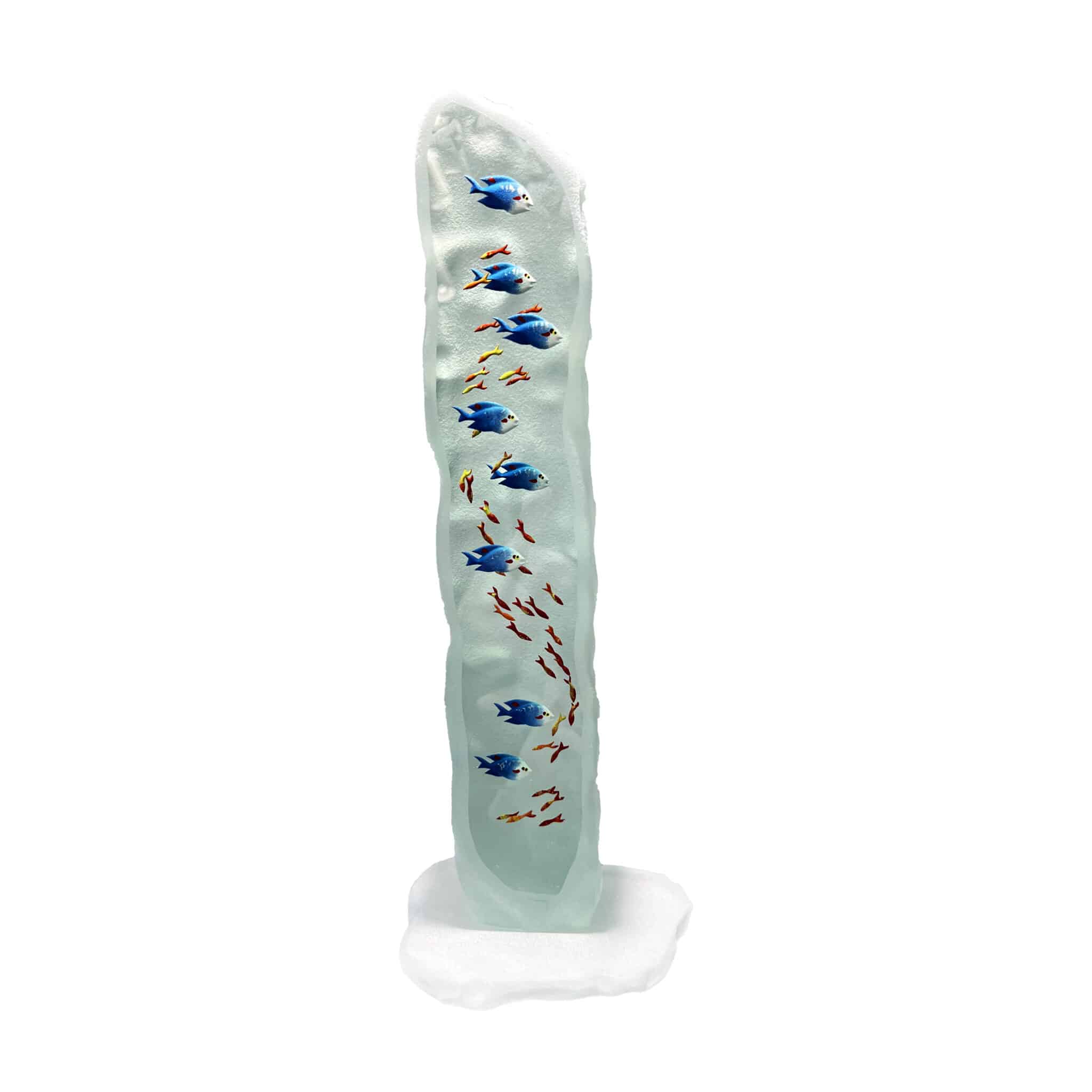 Décor entièrement réalisé à la main par gravure à froid sur plusieurs épaisseurs et inclusions de pigments de couleurs, figurant un motif de lagon aquatique en trois dimensions, montrant une multitude poissons multicolores, de coraux ou d’algues, sur fond de grotte marine.