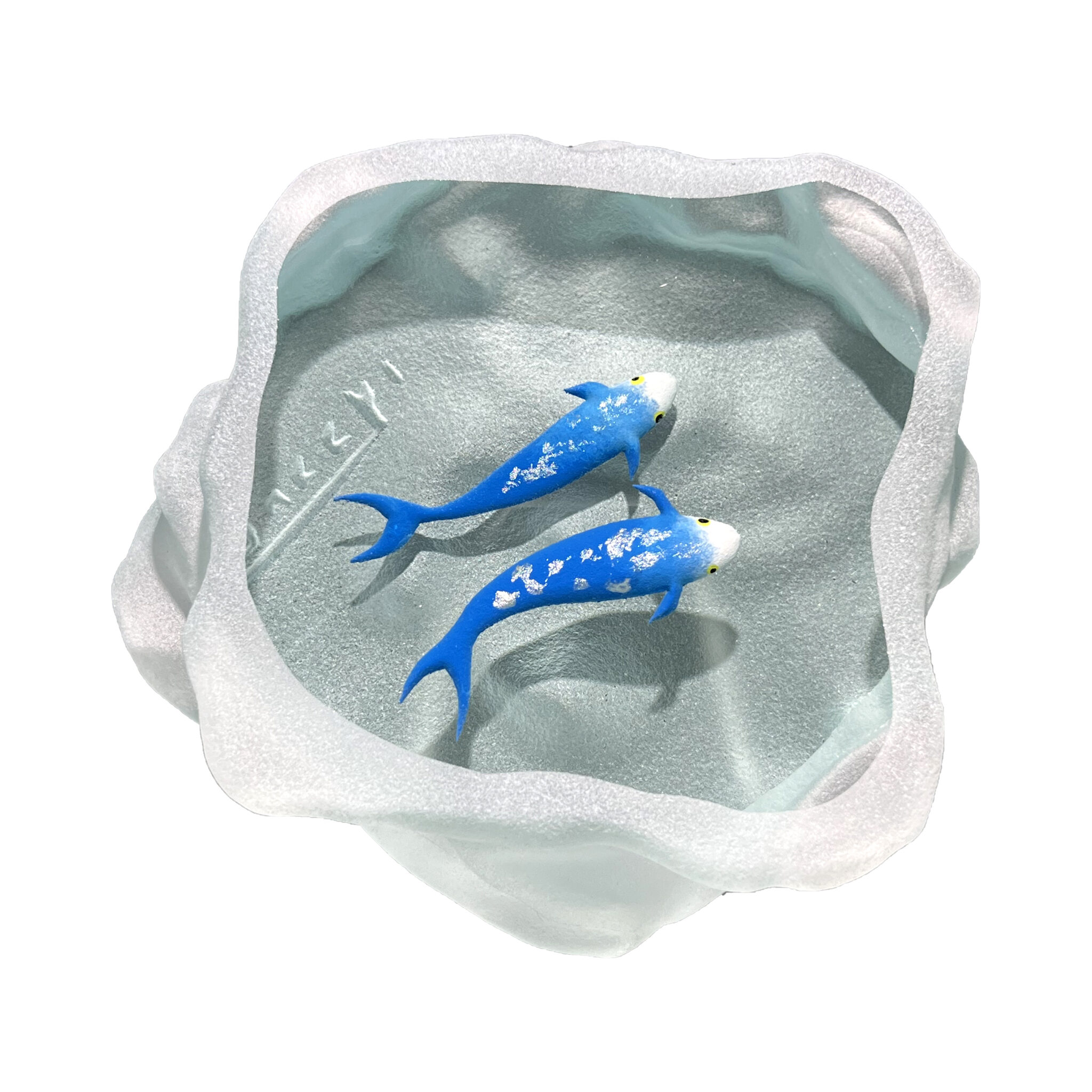 Décor entièrement réalisé à la main par gravure à froid sur plusieurs épaisseurs et inclusions de pigments de couleurs, figurant un motif de lagon aquatique en trois dimensions, montrant une multitude poissons multicolores, de coraux ou d’algues, sur fond de grotte marine.
