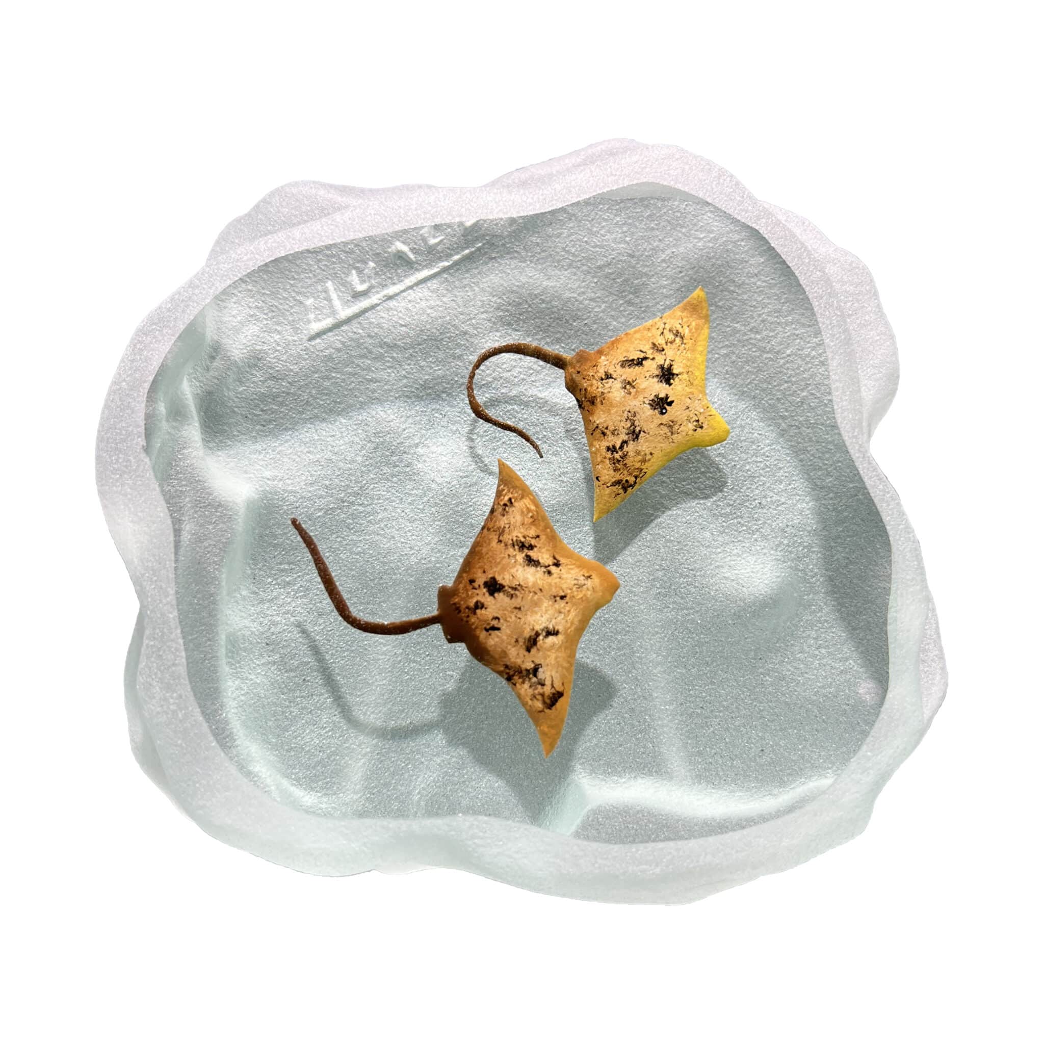 Forme libre horizontale présentant une face lisse et transparente, ainsi qu’un contour translucide et dépoli.